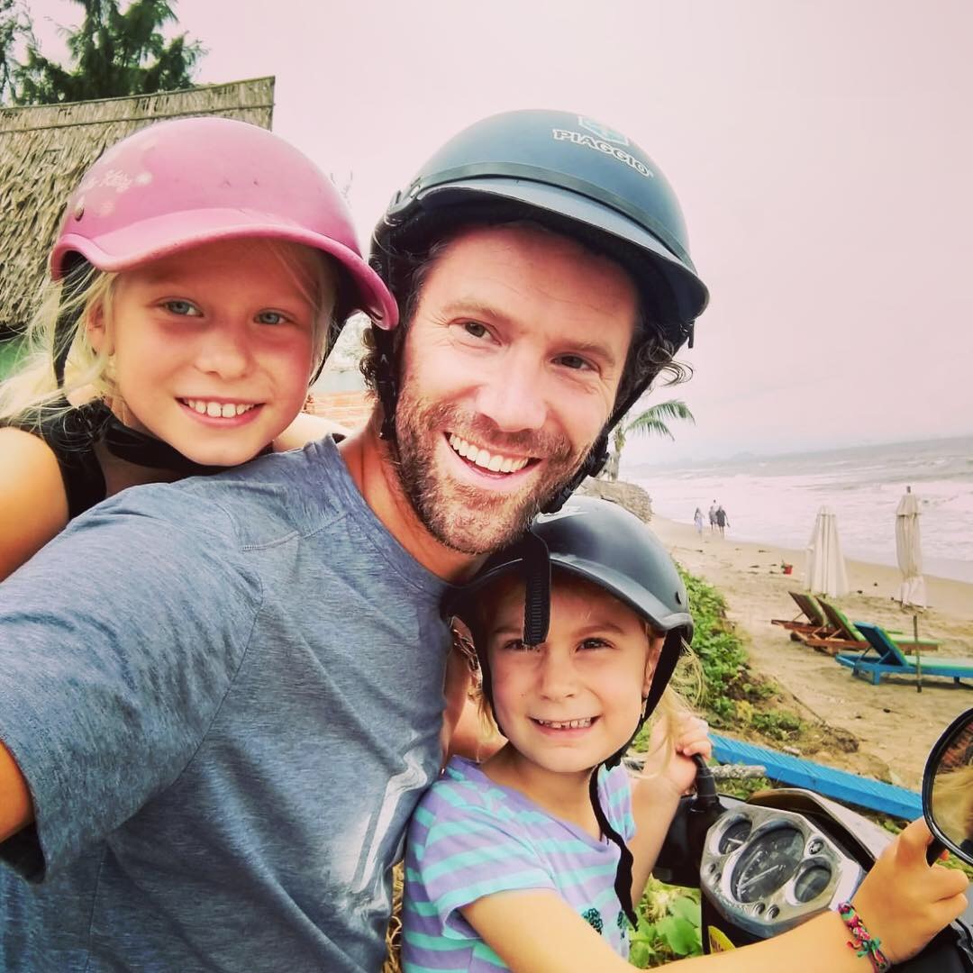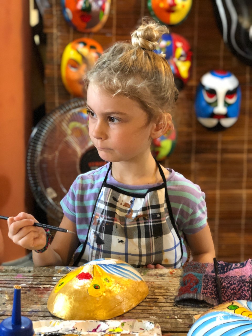 Een greep uit onze activiteiten: met een scooter door de kleine weggetjes langs de rivier crossen. Hard gillen op het strand waar de wind en de golven op de zandzakken beuken. Naar een theatervoorstelling met mooie danseressen. Een eigen masker schilderen. Zwemmen in de regen. Vietnamese pannenkoeken maken. Worteltaart eten bij de Australische deli op de hoek. En een zeiknatte fietstocht over de eilandjes.
