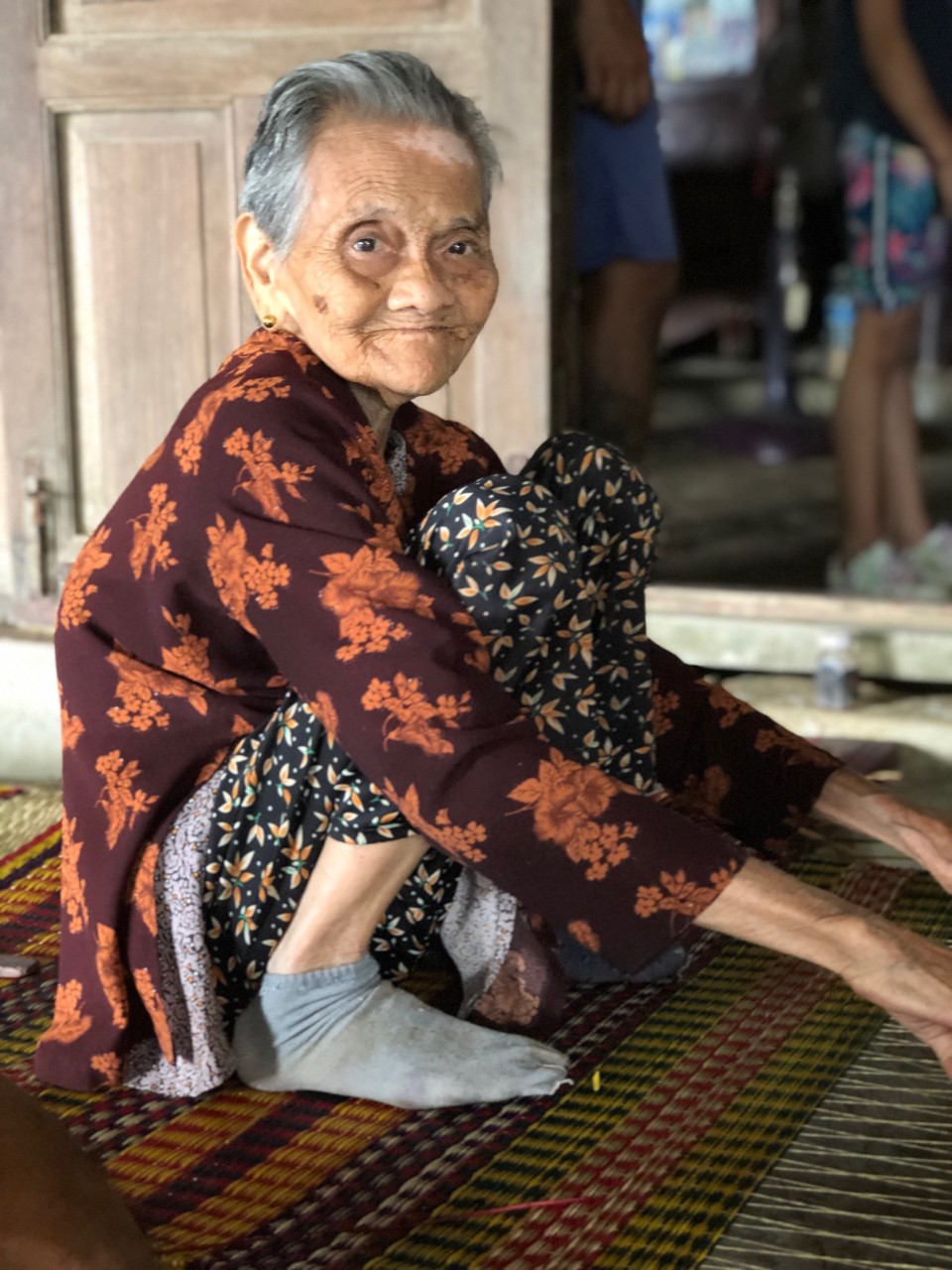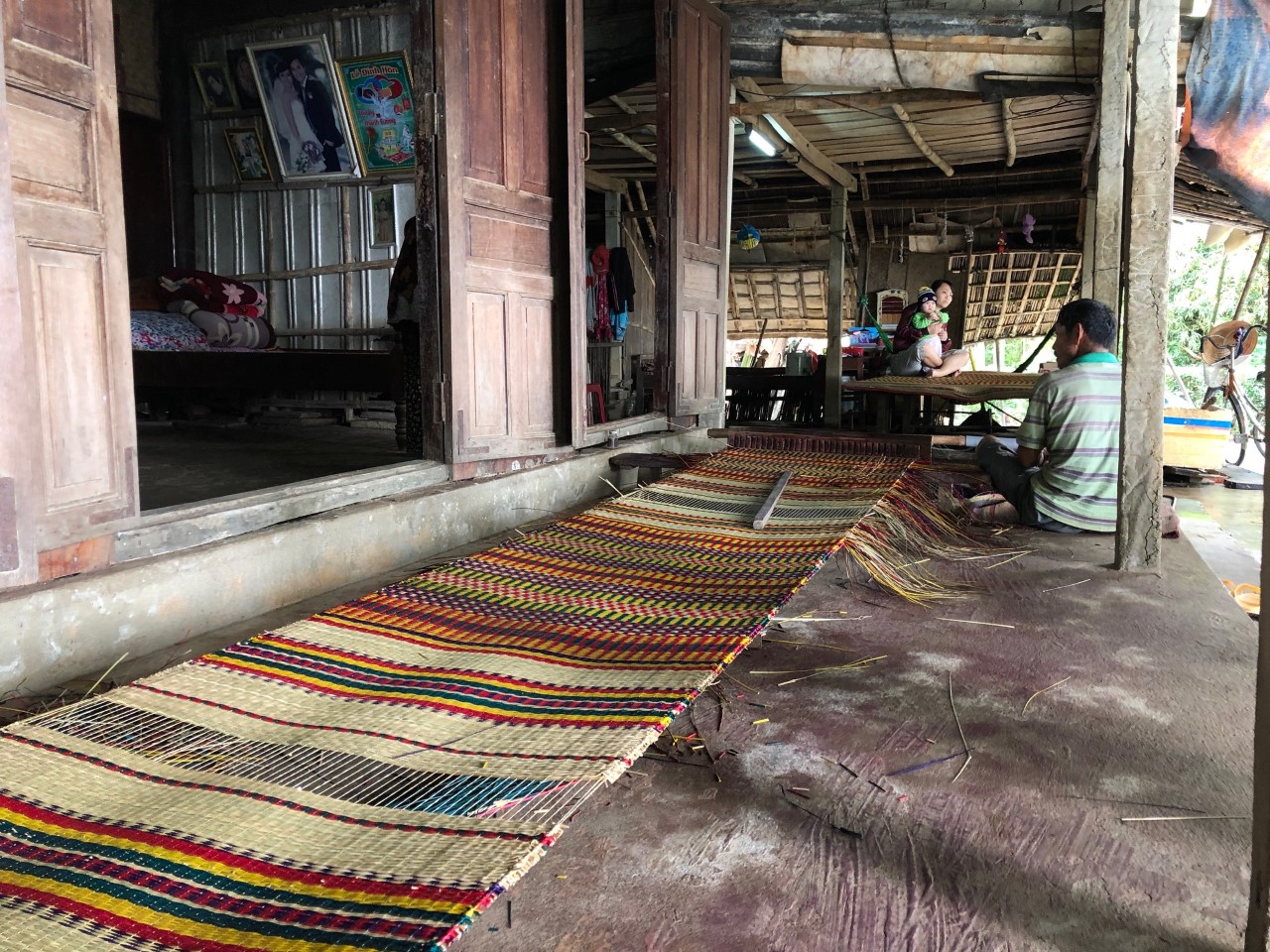 “Waarom loopt die mevrouw zo krom?” vraagt Terra mij. We zijn met een fietstour mee en fietsen 20 km langs lokale ‘fabriekjes’. Bij de eerste stop konden we zien hoe ze rijstvellen voor loempia’s maken, bij de tweede hoe ze houten, oceaanwaardige boten bouwen en bij de derde een mattenweverij. Er loopt een oud omaatje, haar rug is zo krom als een garnaal en haar benen staan in een rare stand. Ze neemt op haar hurken plaats op de drie meter lange mat en gaat verder met weven. Onze gids Lyna vertelt: “Deze vrouw is 98 jaar en weeft al sinds haar 8e levensjaar. Omdat ze iedere dag wel 10 uur gehurkt zit kan ze niet meer normaal lopen.” Ik buig naar Terra en vertel haar wat ik zojuist heb gehoord. De mat ziet eruit als zo één die je koopt bij de Xenos, maar dan in het groot. “Hoeveel kost zo’n mat?” vraag ik. “4 dollar” antwoord ze. ‘Wat?’ denk ik bij mezelf. Riet snijden, stengels halveren, drogen, kleuren, weer drogen, sorteren, vervolgens drie uur weven en dat kost 4 dollar? “Yes, and there comes a middle man, buys a lot of mats and sell them for 30 dollar each,” voegt ze er nog aan toe. Ik kan niet anders dan diep buigen voor deze mevrouw. Ongelooflijk. Haar ogen kijken niet ongelukkig, ze sprankelen zelfs. Ze is trots.