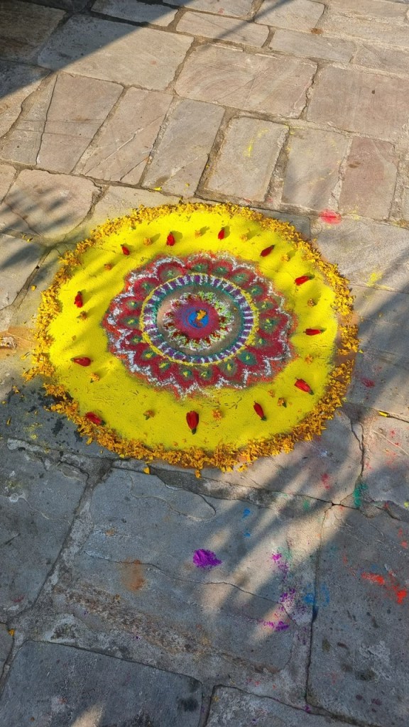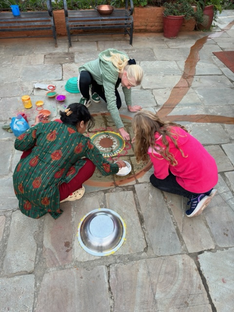 Het is de tweede dag van Tihar. Het vijfdaagse Hindustaanse feest van licht, kleur, familie en iedere dag wordt er een dier vereerd. Vandaag de koe, gisteren de hond. Daar waar de zwerfhonden normaliter wordt weggekssjt, krijgen ze met Tihar een bloemenkrans om de nek en een stip op de kop. Dit feest kenmerkt zich door de vele kaarsjes, lampjes en bloemenslingers die het huis versieren, prachtige rode sari’s gedragen door de vrouwen, een speciale dag waarop broers en zussen elkaar cadeautjes geven, vloerdecoraties met hoe kan het anders: koeienpoep en heel, heel veel rituelen. Soms doet het hier en daar een wenkbrauw rijzen bij ons westerlingen. Ruud vroeg aan mij: “Wat ben je aan het doen?” Ik zat al een half uur gebogen over een klein bosje gras ten grootte van mijn vuist. “Ik moet het mooie gras eruit zoeken. Voor in de schenktuit van het water.” Terra en Maila kregen een mandje in de handen geduwd met Afrikaantjes. De bloemblaadjes moesten eraf worden gehaald, maar niet het zwarte gedeelte (van een halve centimeter) van de stamper. Dan moest alles weer overnieuw. Tijdens de broers- en zussenceremonie werd er water gesprenkeld rondom degenen die geëerd werden, als een soort barrière. Daarna werd er een walnoot kapot geslagen met een belegde kokosnoot, om de kwade geesten te laten zien dat ze zich er niet mee moeten bemoeien. En aan het eind eet iedereen zich misselijk in chocola, gefrituurde oliebollensnacks, mandarijnen en deegringen waar je, als ze eenmaal hard zijn geworden, het oudhollands ringwerpen mee kan winnen.