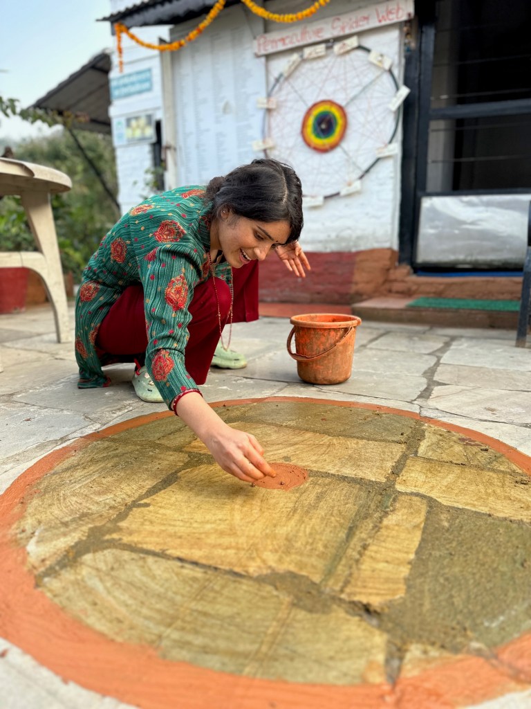 Shrinu straalt met haar hele gezicht en graait met haar blote handen in de verse koeienflats. Ze stopt het in een plastic boodschappentasje. Haar handen zijn nog rood en geel van de kleurstof waar ze de koe net mee heeft vereerd, door hem een ‘tika’ (stip) op het voorhoofd te geven.