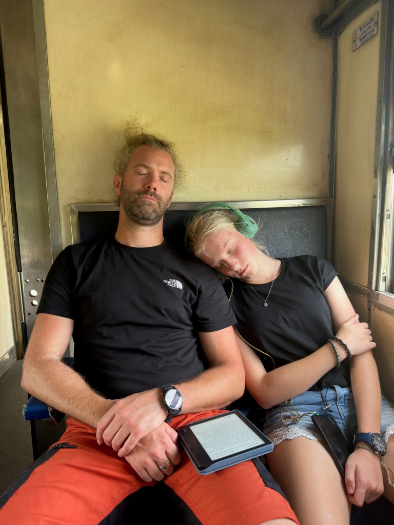 Dit hadden we niet helemaal zo bedacht. Terwijl ik dit typ is het 35 graden in onze trein, derde klas, geen airco maar een paar wiebelige ventilatoren aan het plafond en we zitten zo goed als naast de ranzige hurkwc waarvan de deur open blijft staan. Als de trein langzaam rijdt is het nog warmer, aangezien er dan weinig wind door de open ramen komt en de zure urinestank de geur aanneemt van een open riool. Mijn benen plakken aan het te kleine vierzitsbankje wat verschuift als iemand van ons beweegt, terwijl het landschap met bananenbomen en rijstvelden voorbij rammelt. Vijf uur lang bezweet opgefrommeld zitten als een gekookt sardientje in een trein die van armoe uit elkaar valt. De Thai zelf zitten in lange spijkerbroeken en dikke truien naast ons. Alsof het winter is. Ik las dat het in Nederland heeft gesneeuwd in het zuiden. Doe mij een sneeuwbal. Het is hier verdikkeme 35 graden en waarschijnlijk in de trein nog vijf erbij.