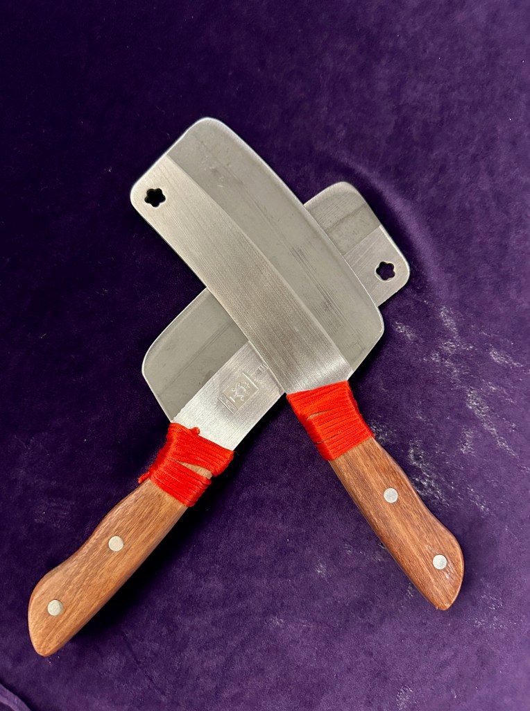 Hij zwaaide met de messen als een ware goochelaar boven een opengeklapte kantoorklapper. Op de A-4 tjes stonden allemaal rare tekens, nauwelijks leesbaar door de verfrommelde, plastic insteekhoesjes. Om me heen stonden grote knuffels van luipaarden, apen en draken. Alsof het de opslag van kermisknuffels betrof. Aan de muur hingen grote posters van draken (omdat het het jaar van de draak is in Chinese contreien) en aan de andere kant van de massagetafel lagen brokken meteoriet op een grote plank. De man in kwestie bleek de eigenaar te zijn.
