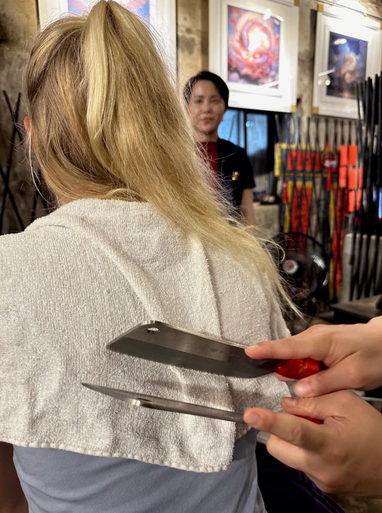 “Oke. Ik ga je zo masseren met deze messen die zijn gemaakt van meteoriet en daardoor hebben ze een positief effect op je lichaam. Ze kunnen allemaal kwaaltjes en pijn genezen, omdat ze negatief geladen zijn.”