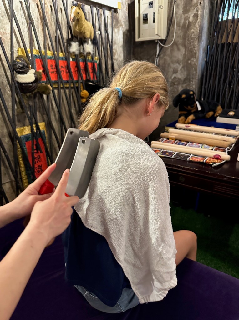 Na 10 minuten vroeg ze hoeveel last ik van mijn nek had, op een schaal van 1 tot 10. Ik wou haar niet teleurstellen, dus ik zei twee. Ze was blij. Zie je wel, het had weer gewerkt. Dat was dan 300 Taiwan Dollar, ongeveer 18 euro.