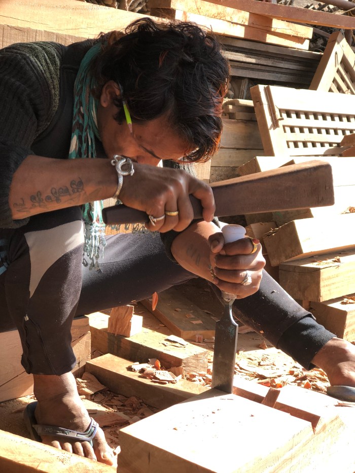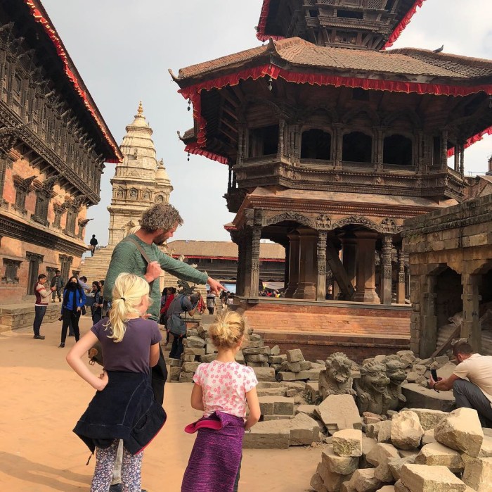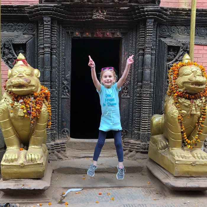 Helaas is de stad vreselijk getroffen is door de aardbeving in 2015. Vele, bijzondere tempels zijn ingestort (67 van de 117). Het kost minstens 30 jaar voordat deze monumenten van houtsnijwerk en steen weer gerestaureerd zijn. We hebben een half uur staan kijken naar de houtsnijders die hun werk minutieus uitvoeren. Ieder detail is belangrijk, ieder hobbeltje, rondje of lijn; alles wordt met hamer en beitel gedaan. Door deze mensen aan het werk te zien ga je het erfgoed nóg meer waarderen. Ondanks de ravage die aangericht is blijft het een fascinerende stad en zeer de moeite waard! Er zijn geen speciale kinderactiviteiten in Bhaktapur, maar wij vonden het heerlijk om ’s ochtends onze schoollessen in het hotel te doen en ’s middags weer een plein of straatje op te zoeken. Een eettip voor ouders die wel eens wat andere smaken willen proeven dan Dal Bhat: Cafe Beyond wordt gerund door een echtpaar waarvan de eigenaresse Koreaans is. Ze serveren heerlijke ‘Bibimpap’. Rijst met verse groenten, Aziatische kruiden, sojasaus en lekkere pittige kip. En dan afsluiten met een toetje van ijs en warme appel. Smullen!
