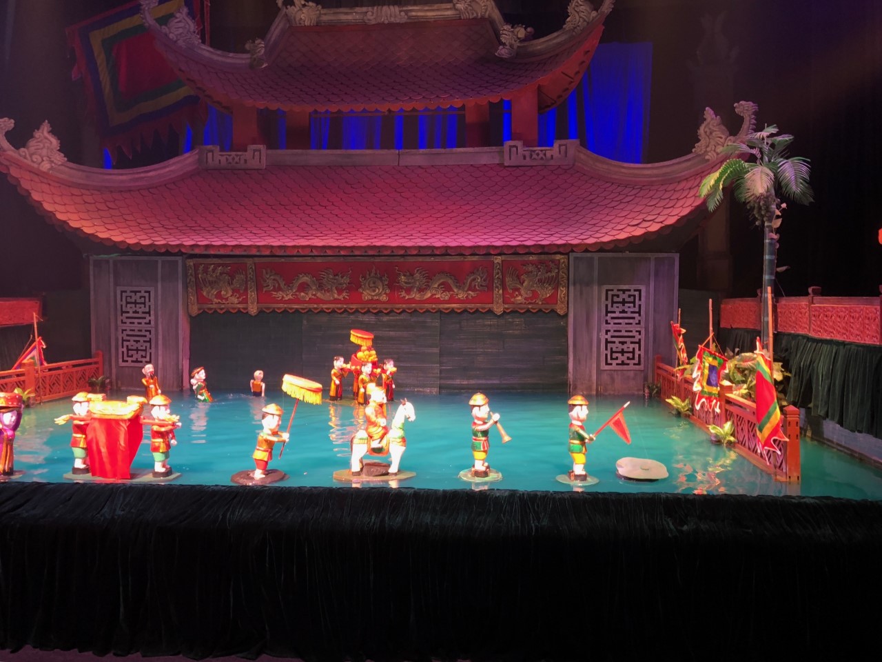 Het toneel is het water. De Puppets vertellen (of eigenlijk is het meer uitbeelden) verschillende verhalen en mythen van Vietnam. De Puppeteers zie je niet, zij zitten achter het decor, ook in het water.