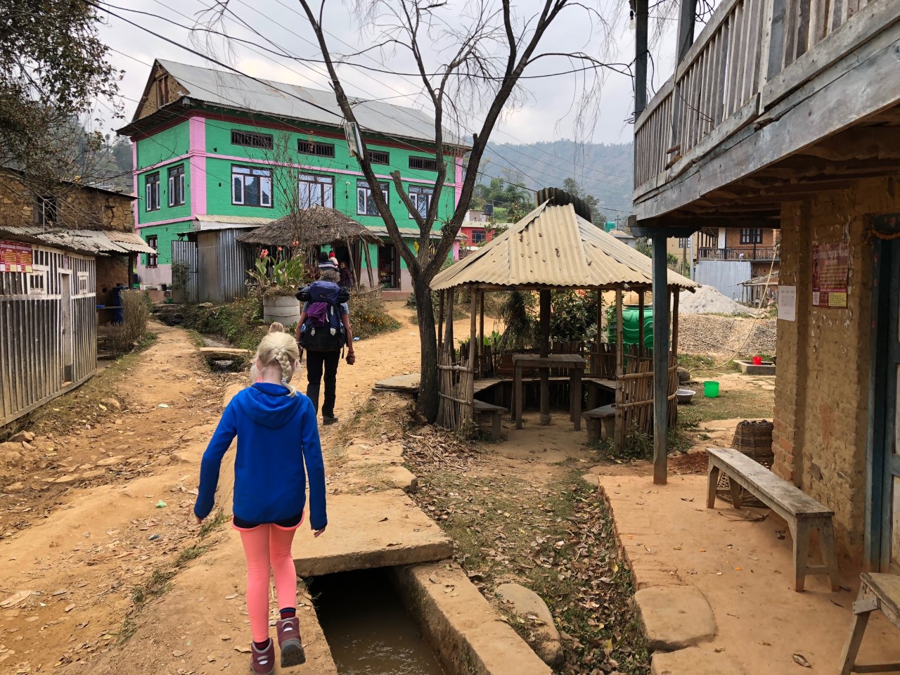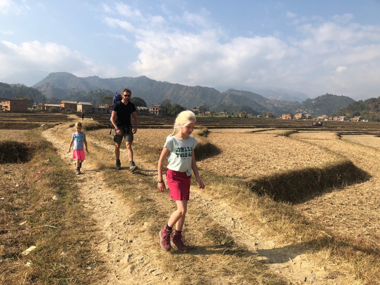 Het Namobuddha resort wordt gerund door een Duits echtpaar en heeft allemaal kleine schattige huisjes. Terra en Maila kregen een Hans & Grietje gevoel bij het houten huisje met twee verdiepingen. Een deur zo groot als een sprookjeshuisje van de Efteling en het plafond van de begane grond was iets te laag voor Ruud z’n 1.90 meter. Maar de ambiance was heerlijk! Je eet gezamenlijk met de andere gasten, koffie en thee is de gehele dag door gratis verkrijgbaar. Ze hebben zelfs verwarming in de huisjes, wat we bijna nergens tegenkwamen in Nepal. Mochten de kinderen nog niet moe genoeg zijn van de wandeling; er staat een hele grote trampoline achterin de tuin. Schommelbanken met een mooi uitzicht, een kampvuur, goede warme douche en lekker eten. Het was jammer dat we er maar ƩƩn nacht waren!